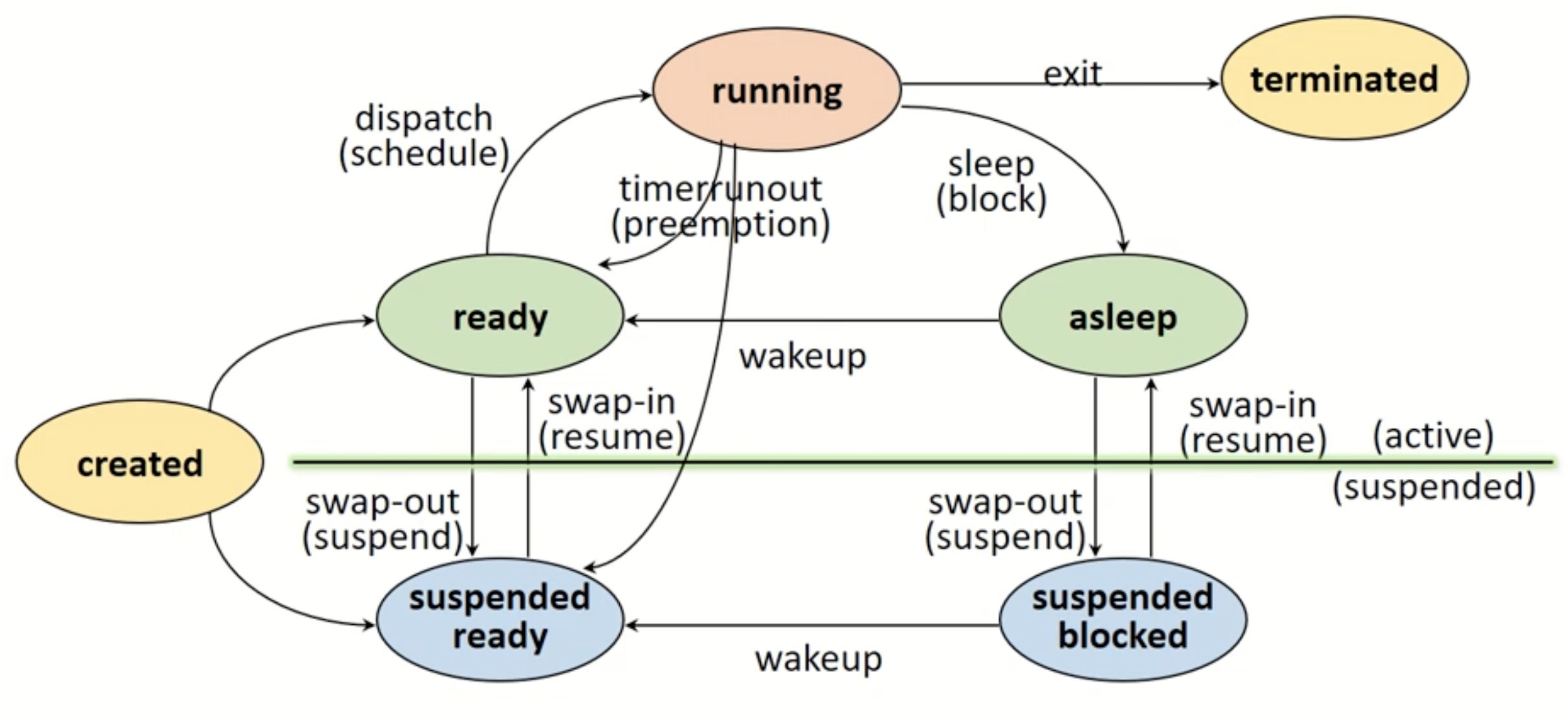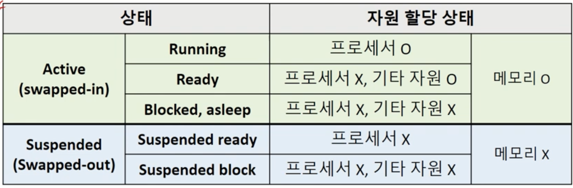 - Swap-out(Suspended): 메모리에서 스왑 장치로 이동